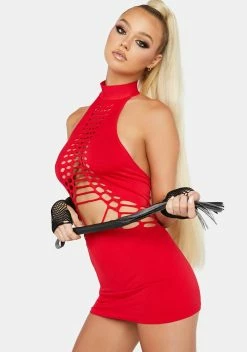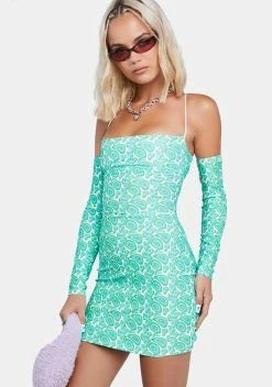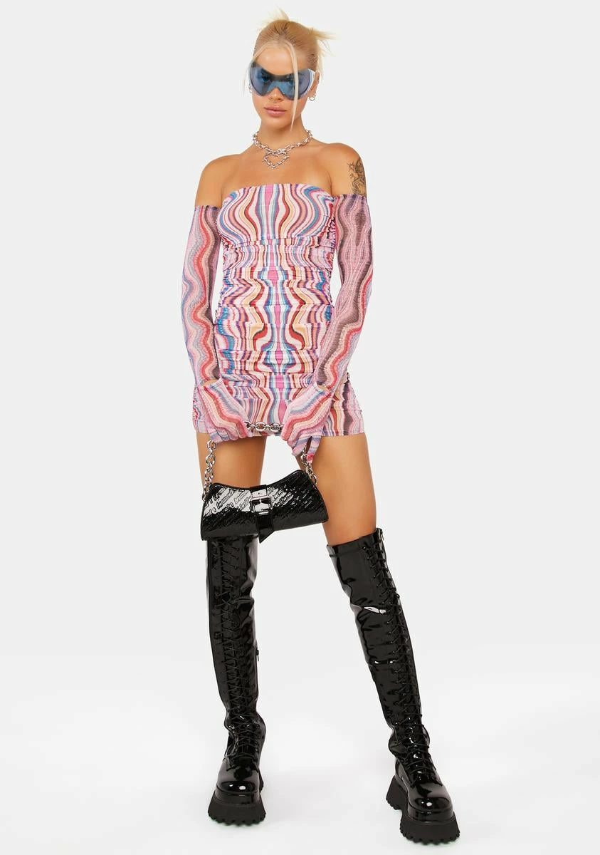 give ’em psychedelic sass. This mini dress and long gloves set has a ruched mesh construction, a bodycon fit, and a colorful trippy print all over.