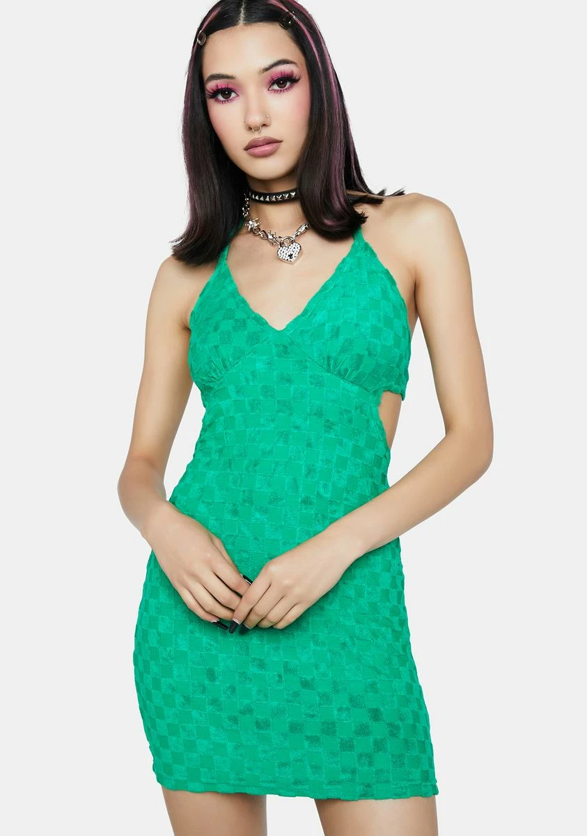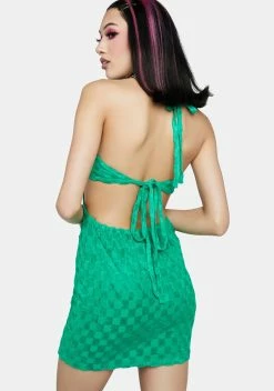 cheers to that! This mini dress has a checkered texture, a V-neckline with halter straps, ruching details at the bust, a cutout at across the back, and a tie closure.