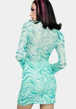 find your groove! This mini dress has a mesh construction, a swirl print, a plunging neckline, slim cutouts at the waist with O-ring hardware, bell sleeves, and a bodycon silhouette.
