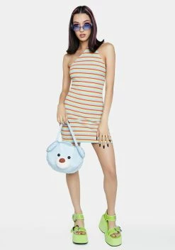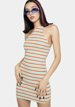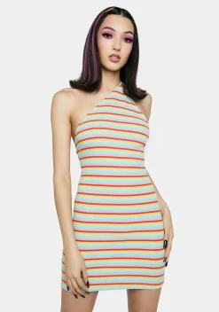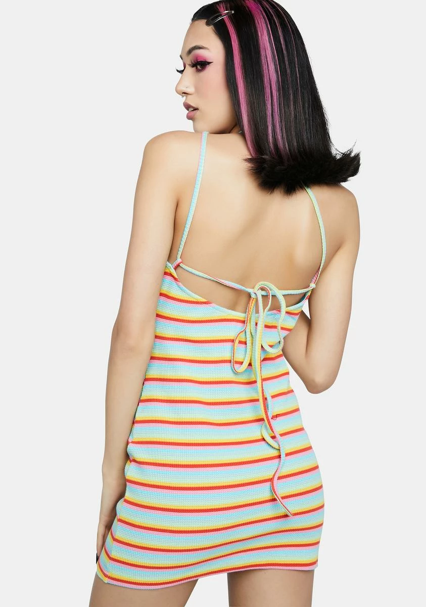 cuz you’re so radiant. This mini dress has an asymmetric one-shoulder neckline, a rainbow stripe print, a tie closure at the back, and a bodycon fit.