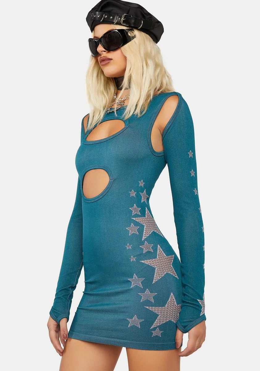 cuz it’s your world, and they’re just living in it. This long sleeve shrug and cut-out mini dress set has a stretchy ribbed material, distressed star cut-out details, and thumbhole cuffs.