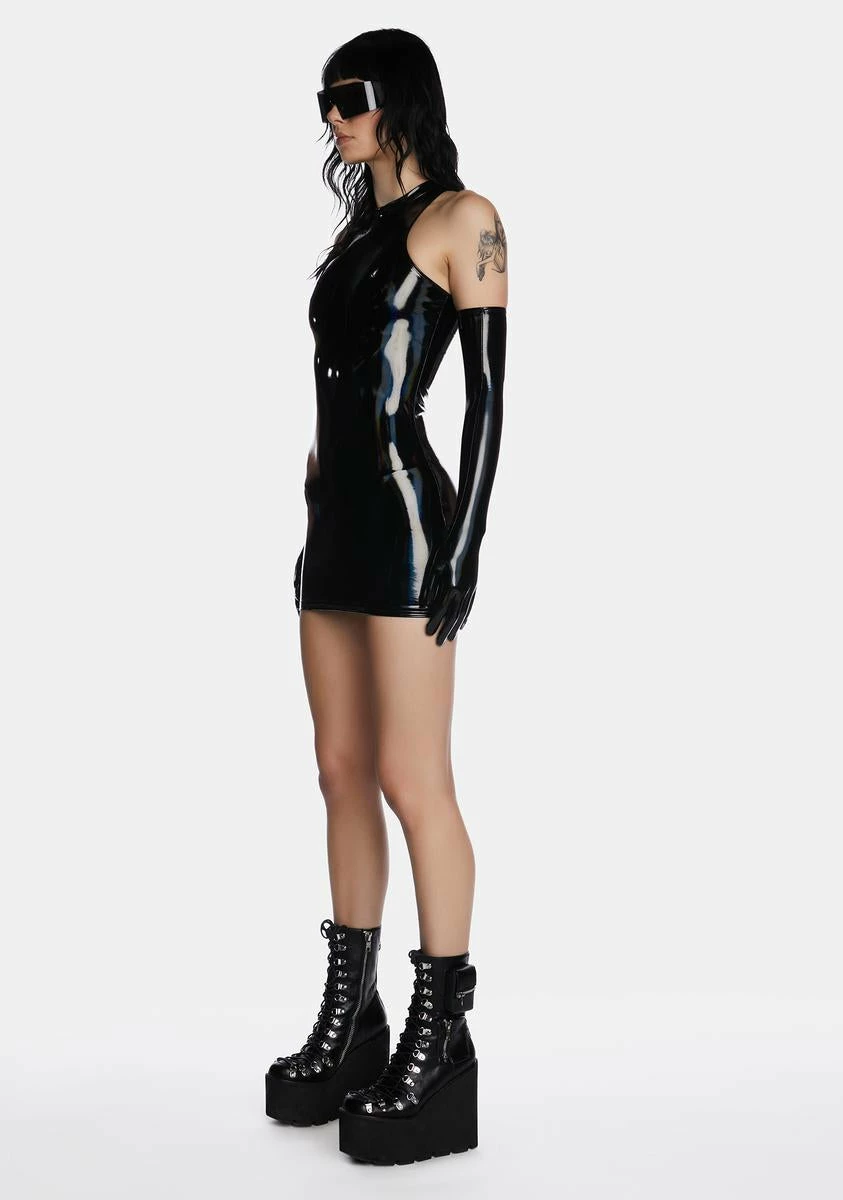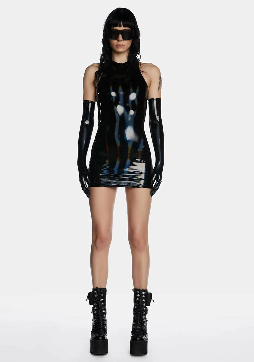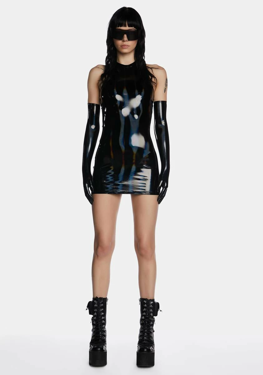 cuz you embrace the starlight nights. This mock neck mini dress has a holographic shine and comes with a matching pair of opera length gloves.