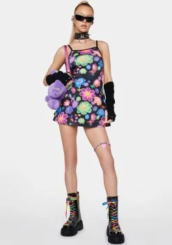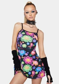 cuz it’s in your nature to rave it up! This mesh mini dress has spaghetti straps, an open back with adjustable tie closures, and a digital daisy print all over.
