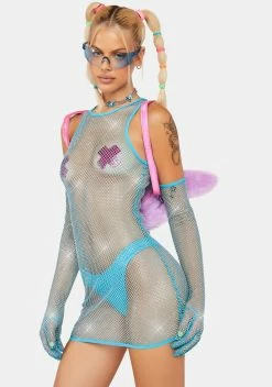 cuz you love all kinds of music! This 3-piece mini dress set has a stretchy fishnet construction with iridescent rhinestones all over, matching long gloves, and cheeky panties to wear underneath.