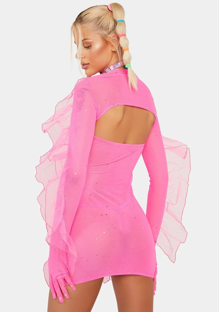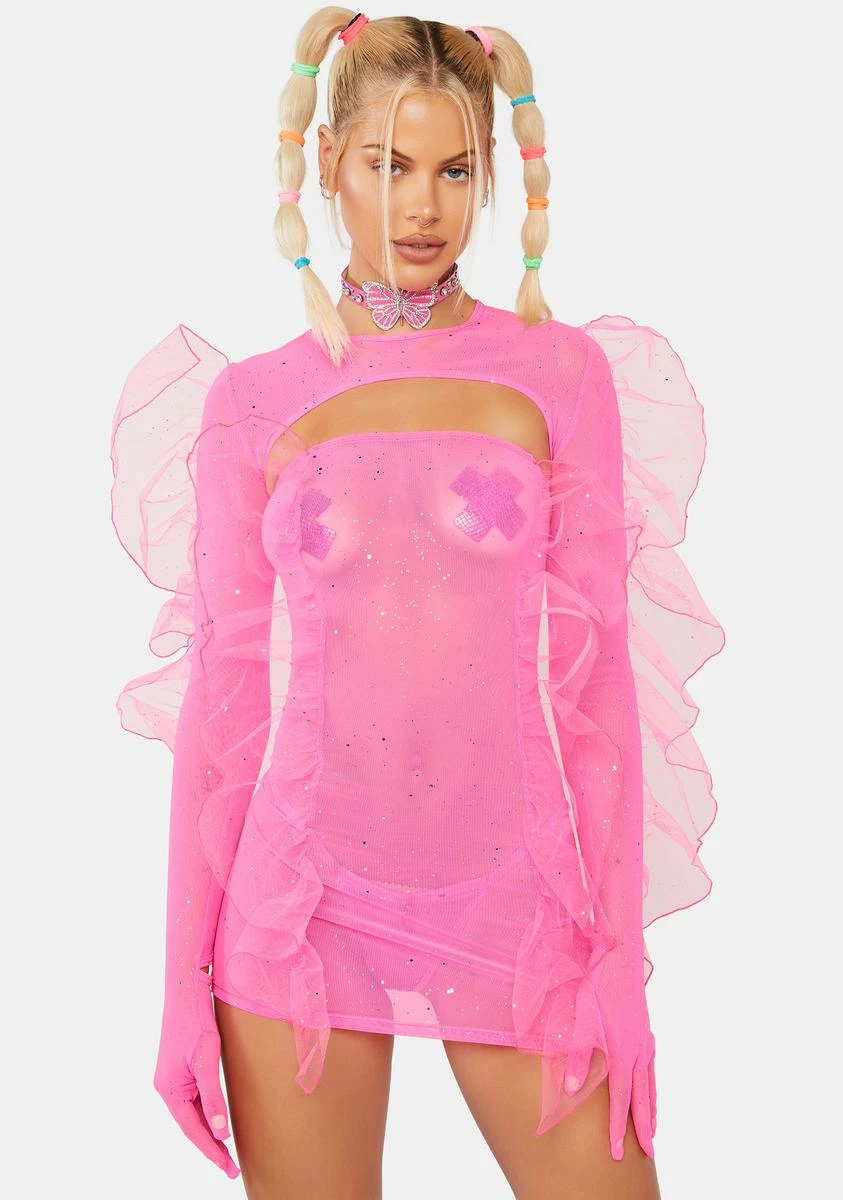 cuz you’re gonna spread the magic, babe! This mini tube dress and long sleeve shrug set has a stretchy mesh construction with silver glitter dots all over, attached gloves, and statement ruffle trim.