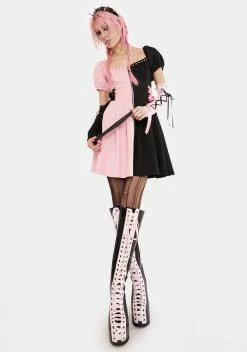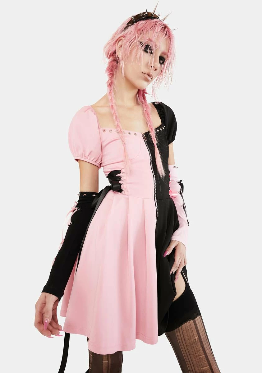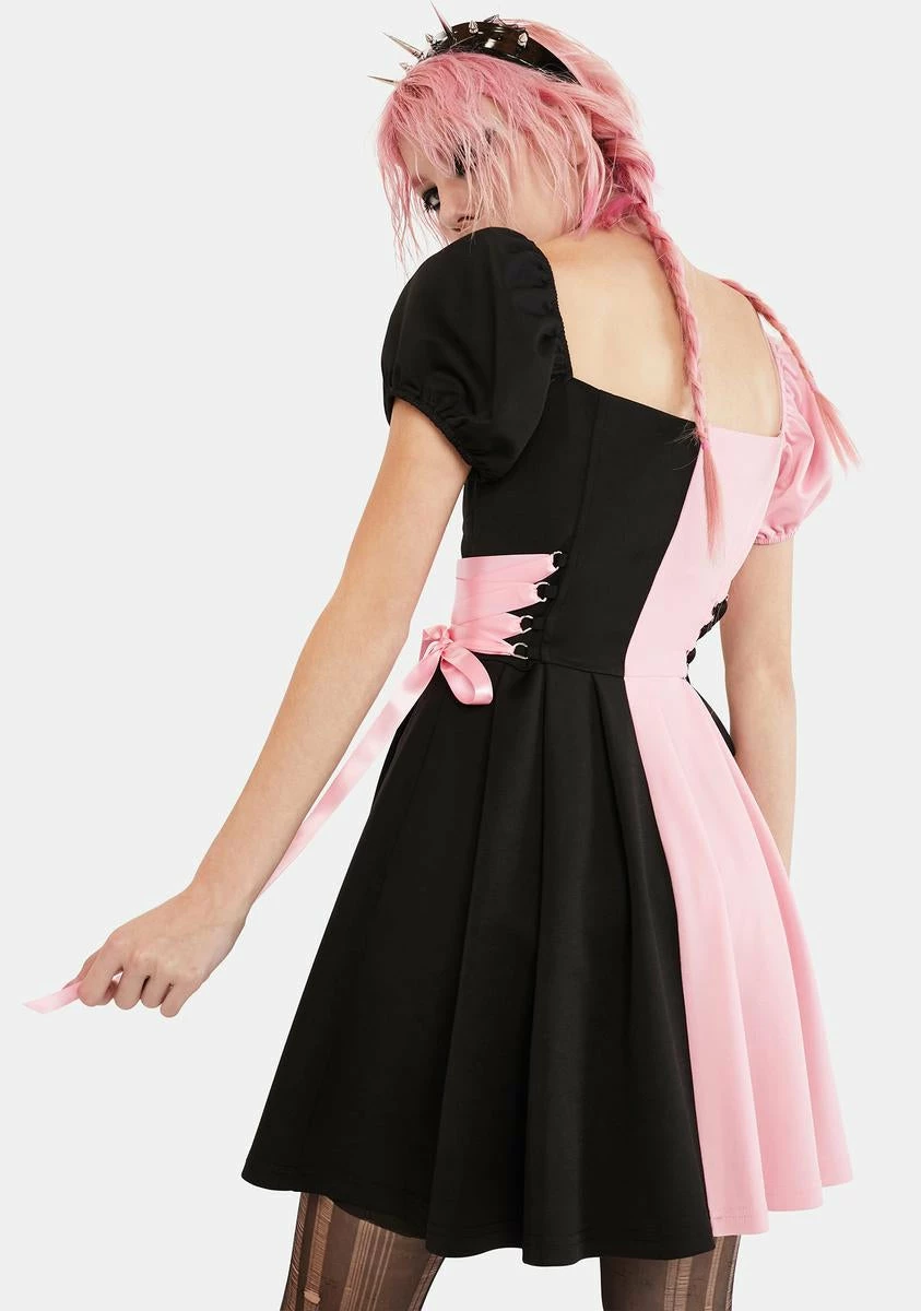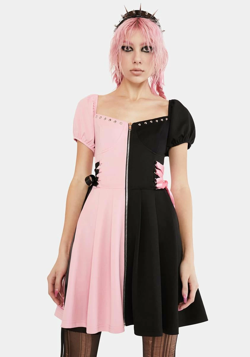 allow me to introduce myself. Turn heads in this fit n’ flare dress that has a split color design, spike studs along the neckline, puff sleeves, contrast satin ribbon lace up ties at the waist, and a zipper closure down the front.
