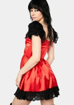 because you don’t have a good side. This mini dress features a satin body, lace trim at the bust and hem, lace short puff sleeves, and a lace ruffle layered skirt.