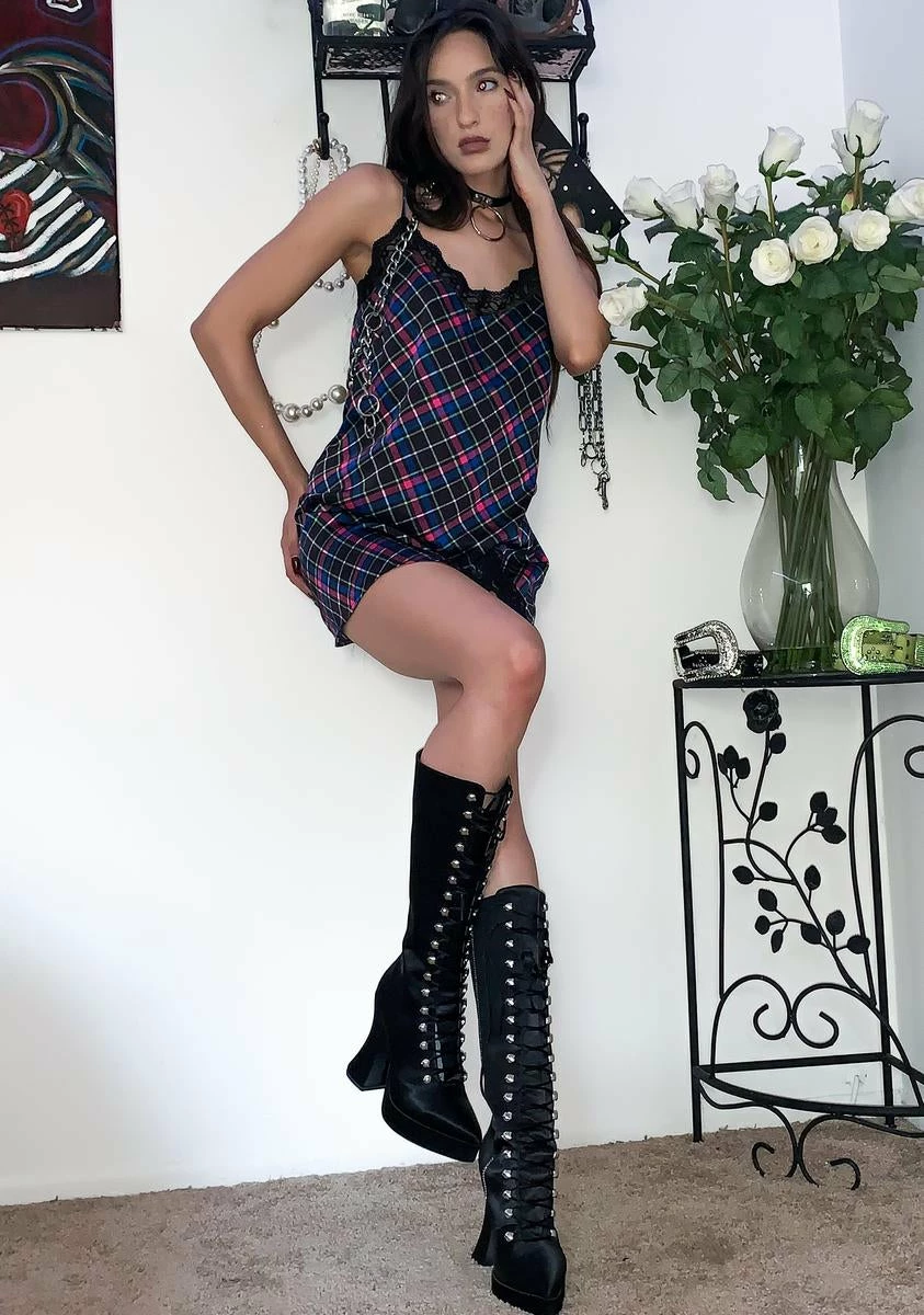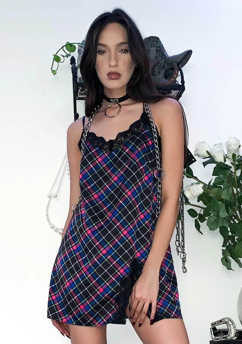 behave myself? Never! Disrespect yer surrounding in this rowdy sleeveless slip dress that has a sikk plaid print, delicate lace trim, a sexy thigh slit, and adjustable cami straps.