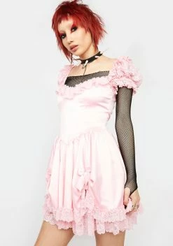 because you don’t have a good side. This mini dress features a satin body, lace trim at the bust and hem, lace short puff sleeves, and a lace ruffle layered skirt.