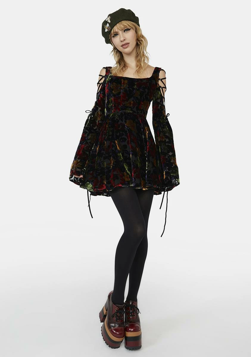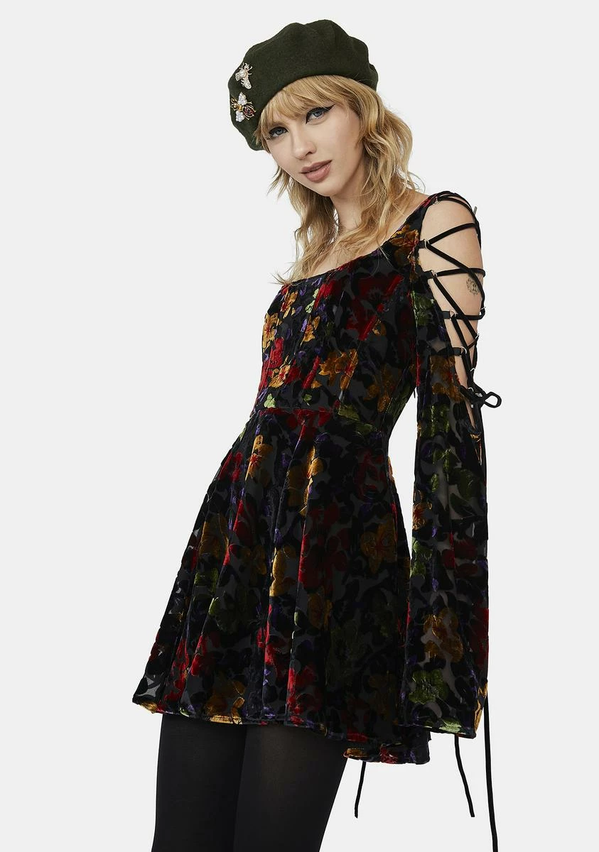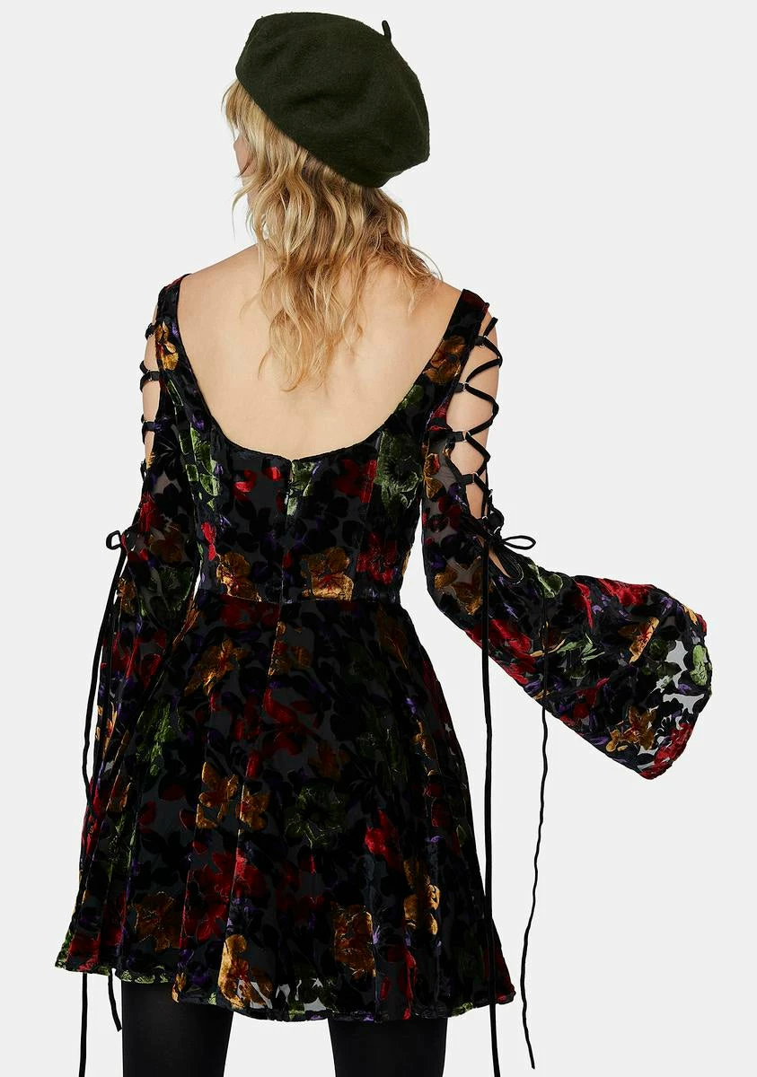 cuz we gotta carry on. This mini dress has a sheer construction with a multi-color floral velvet burnout design, a square neckline, cold shoulder cutouts with lace up details, bell sleeves, and an invisible back zipper closure.