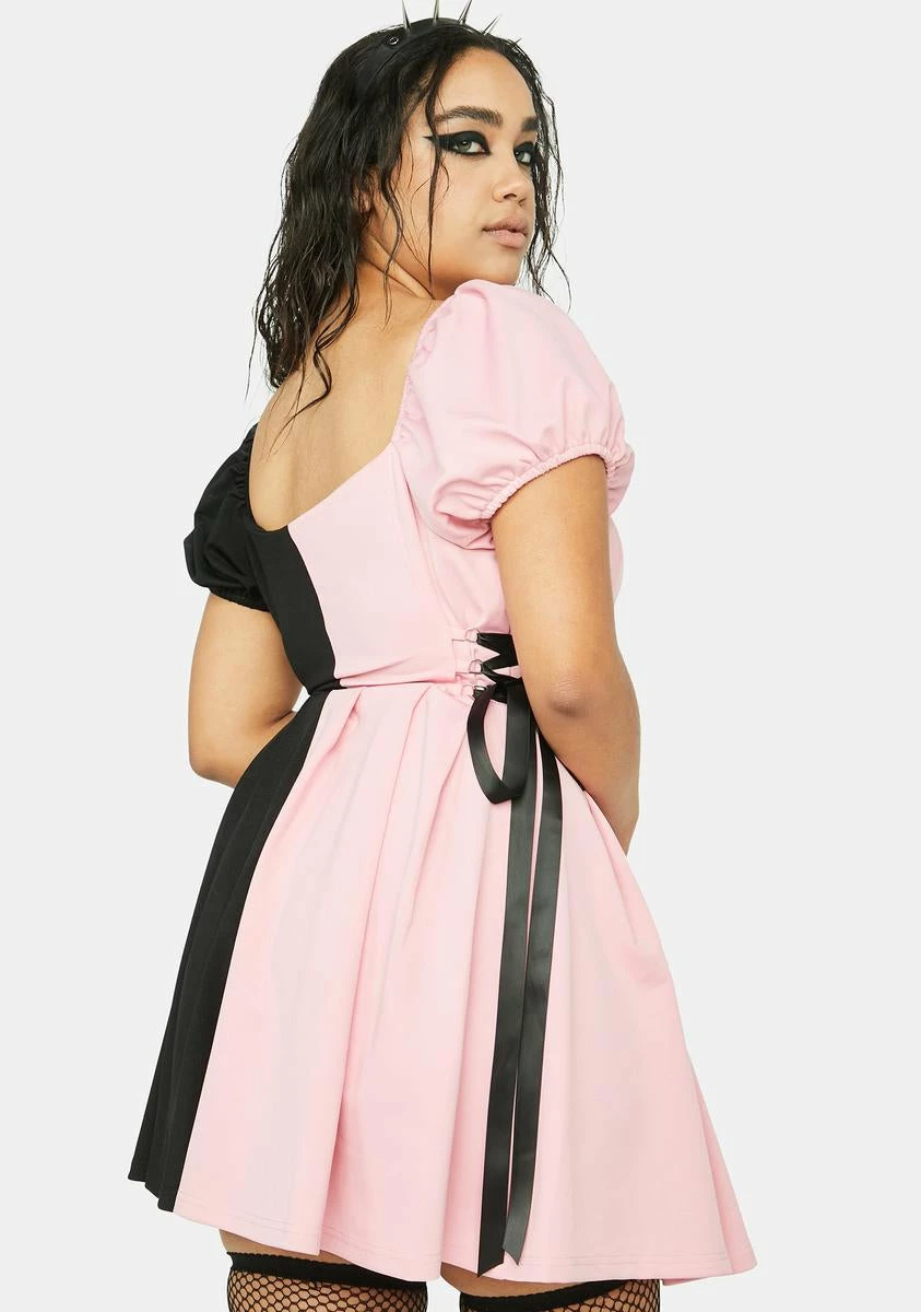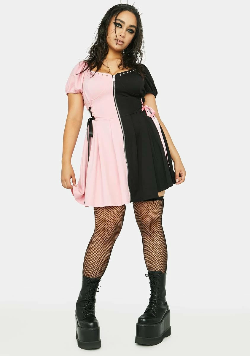 allow me to introduce myself. Turn heads in this fit n’ flare dress that has a split color design, spike studs along the neckline, puff sleeves, contrast satin ribbon lace up ties at the waist, and a zipper closure down the front.