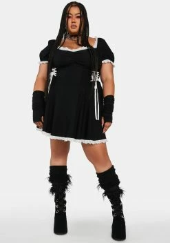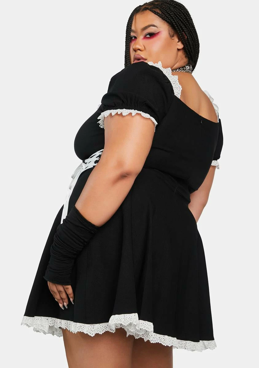cuz you’re anything but innocent. This mini dress has lace-up ribbons at front, ruffled lace trim, short puff sleeves, and a back zip closure.