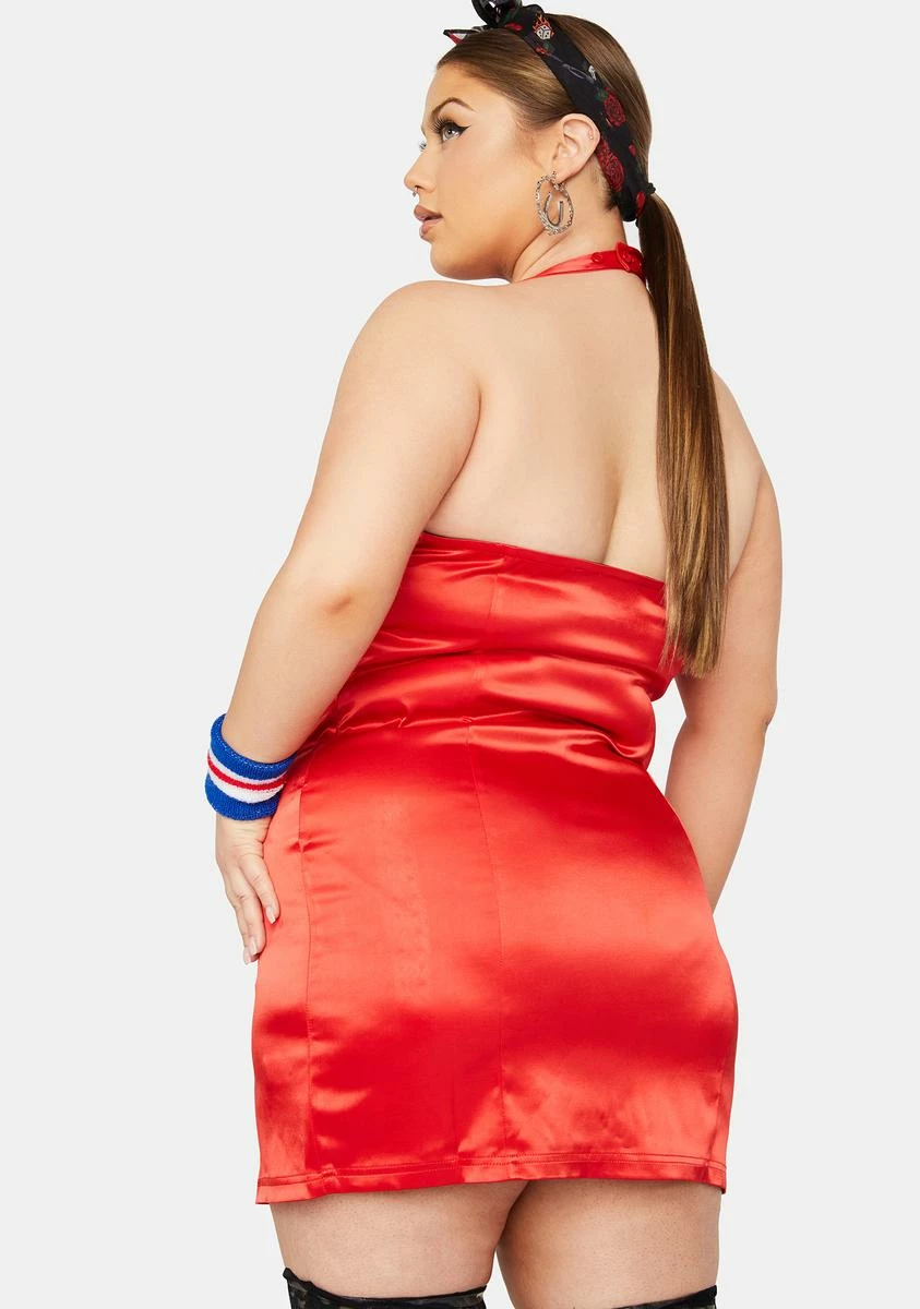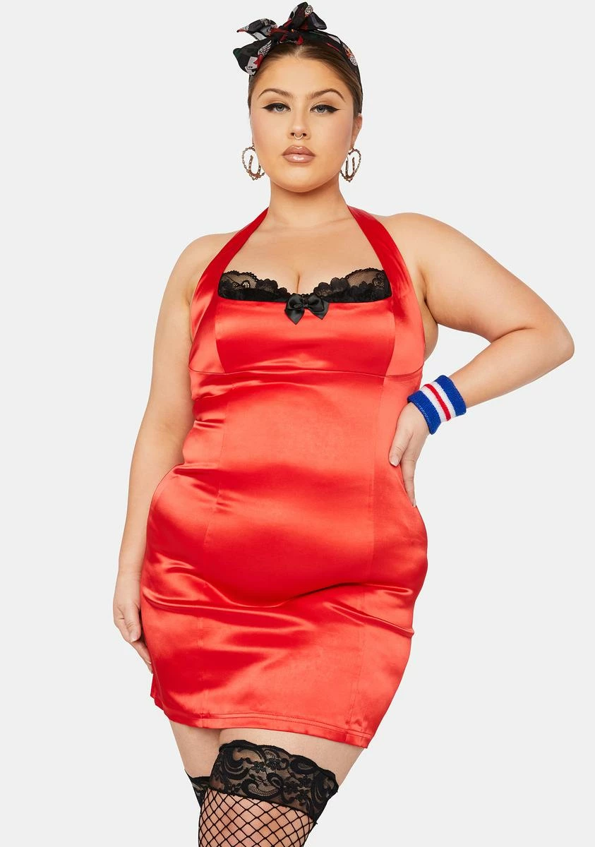 let’s live it up tonight! You’re the life of the party in this mini dress that has a satin construction, a square neckline with scalloped lace trim and a halter strap, a bodycon silhouette, and a side zipper closure.