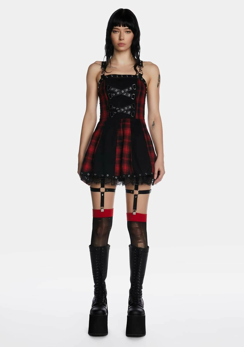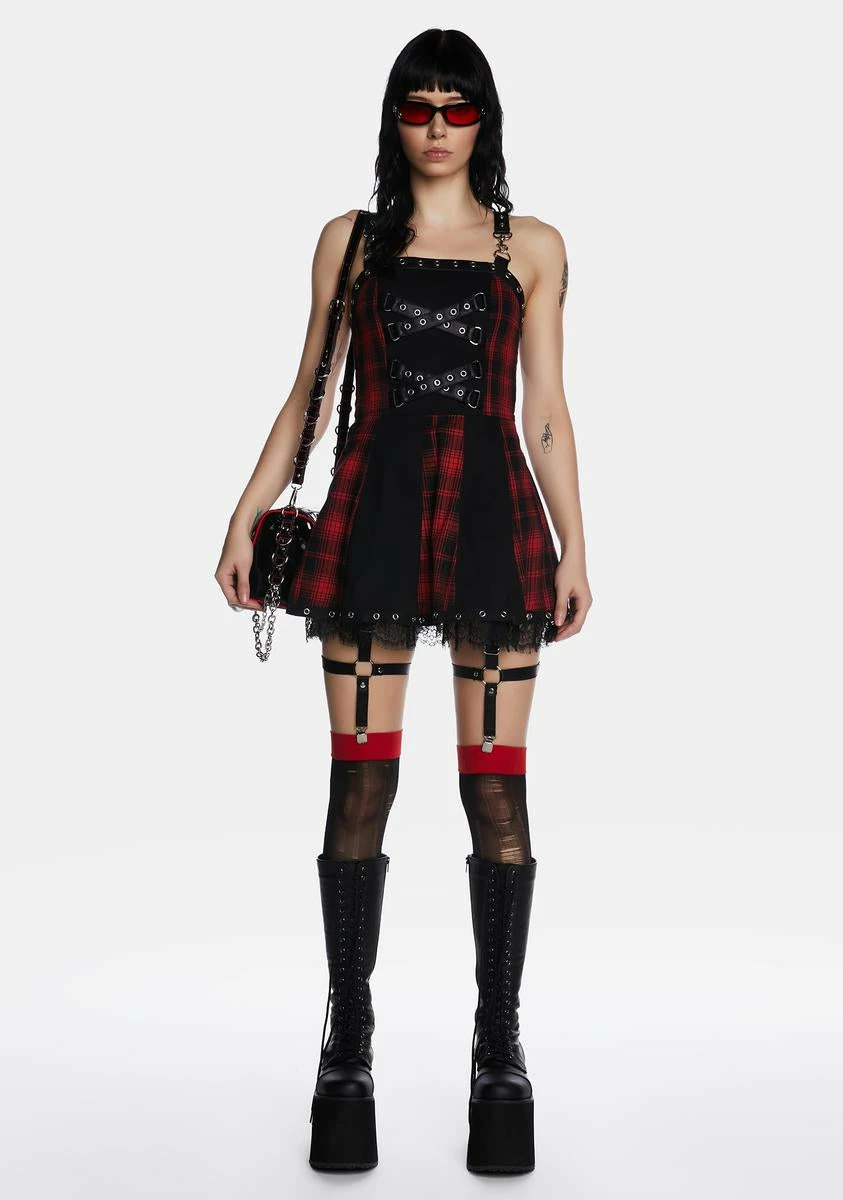 cuz there’s no dress code here. This mini dress has a twill construction, plaid-printed panels, vegan leather trim with grommet and D-ring hardware, a lace-trimmed hem, adjustable shoulder straps with clasp closures, a side zip closure, and a stretchy smocked back.