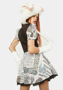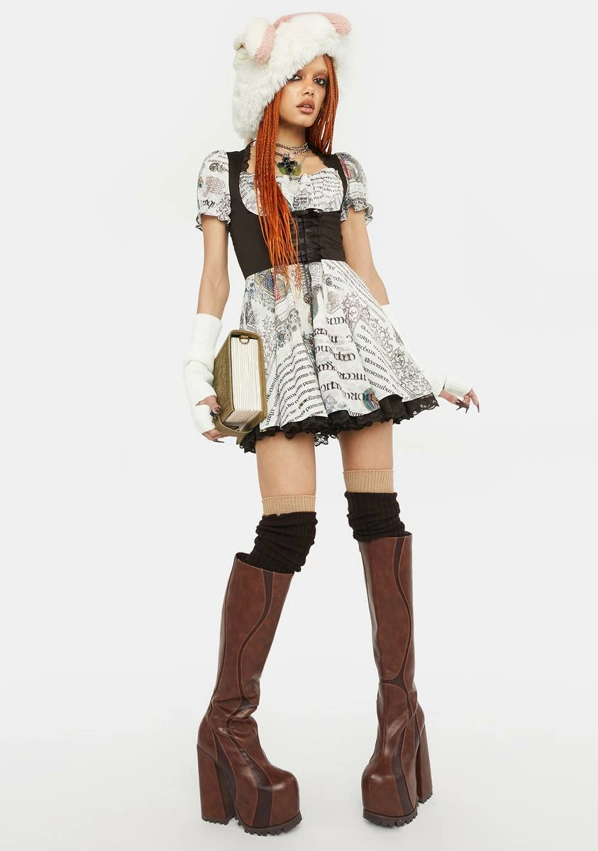 cuz you’ve got tales to tell. This mini dress comes with short puff elastic sleeves, an attached and non-removable underbust corset with a ribbon lace-up closure, a tulle skirt hem, back zip closure, and a storybook print all over.