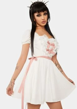 let’s fight the system. This mini dress has sheer lace trim, cross embroidery at the chest, short puff sleeves, and a back cutout with a button closure.