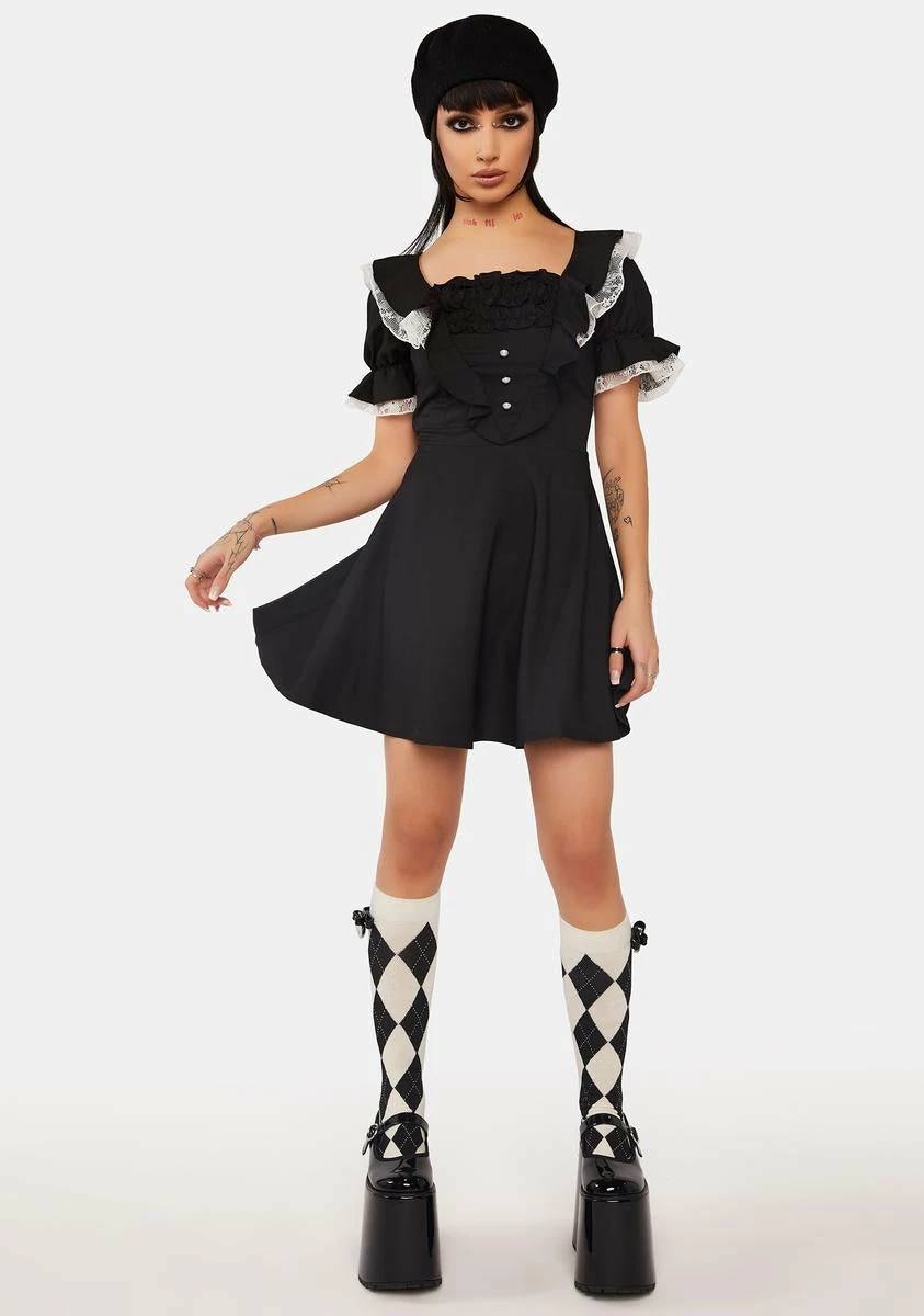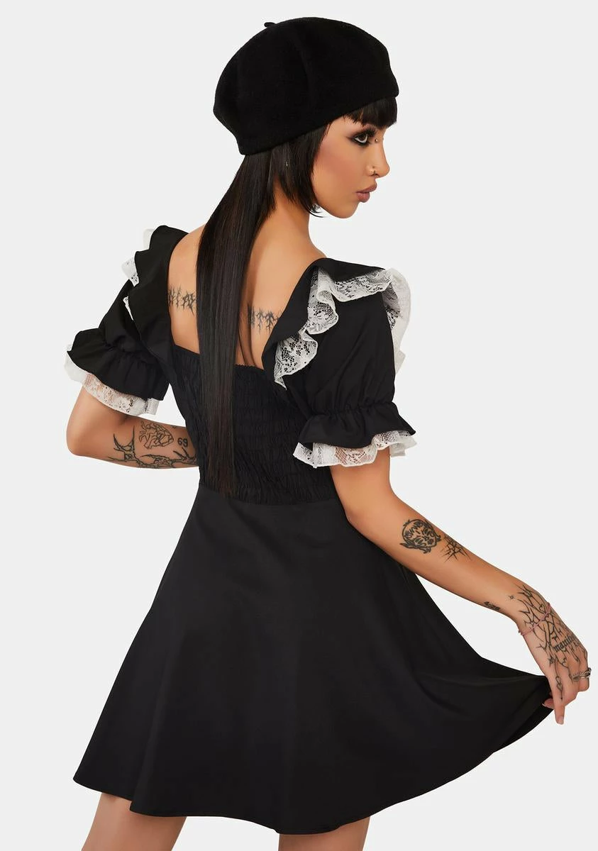 cuz you’ve always been a goth. This mini dress has short puff sleeves, ruffle and lace trim, a sweetheart neckline, decorative pearl buttons, and a side zip closure.
