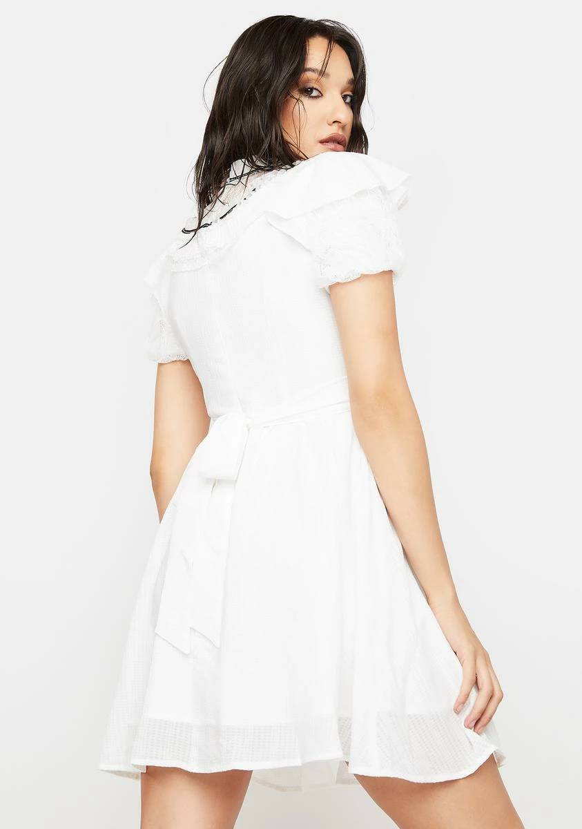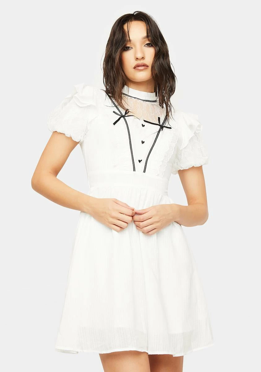 treat me like royalty. This mini dress has a mock neckline, sheer lace paneling across the chest, contrast black ribbons with bows, ruffle trim along the sleeves, a back zipper closure, and a waist tie.