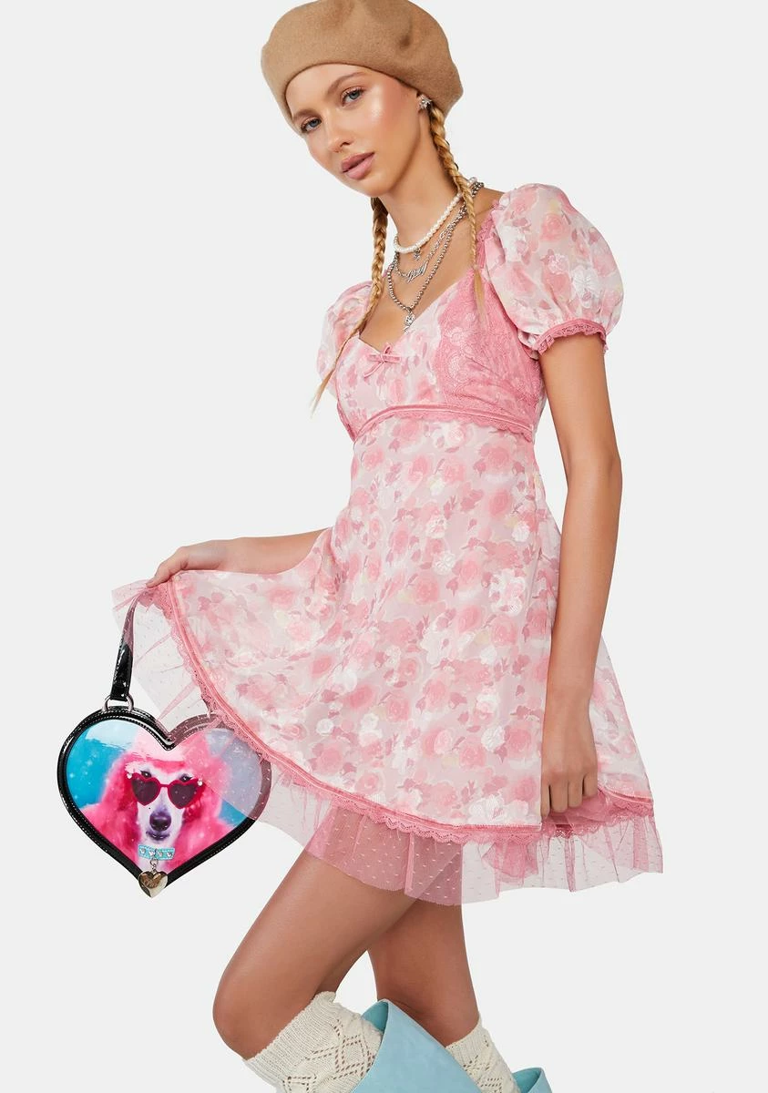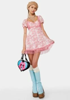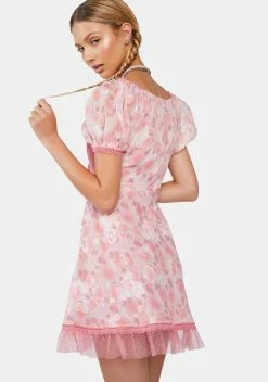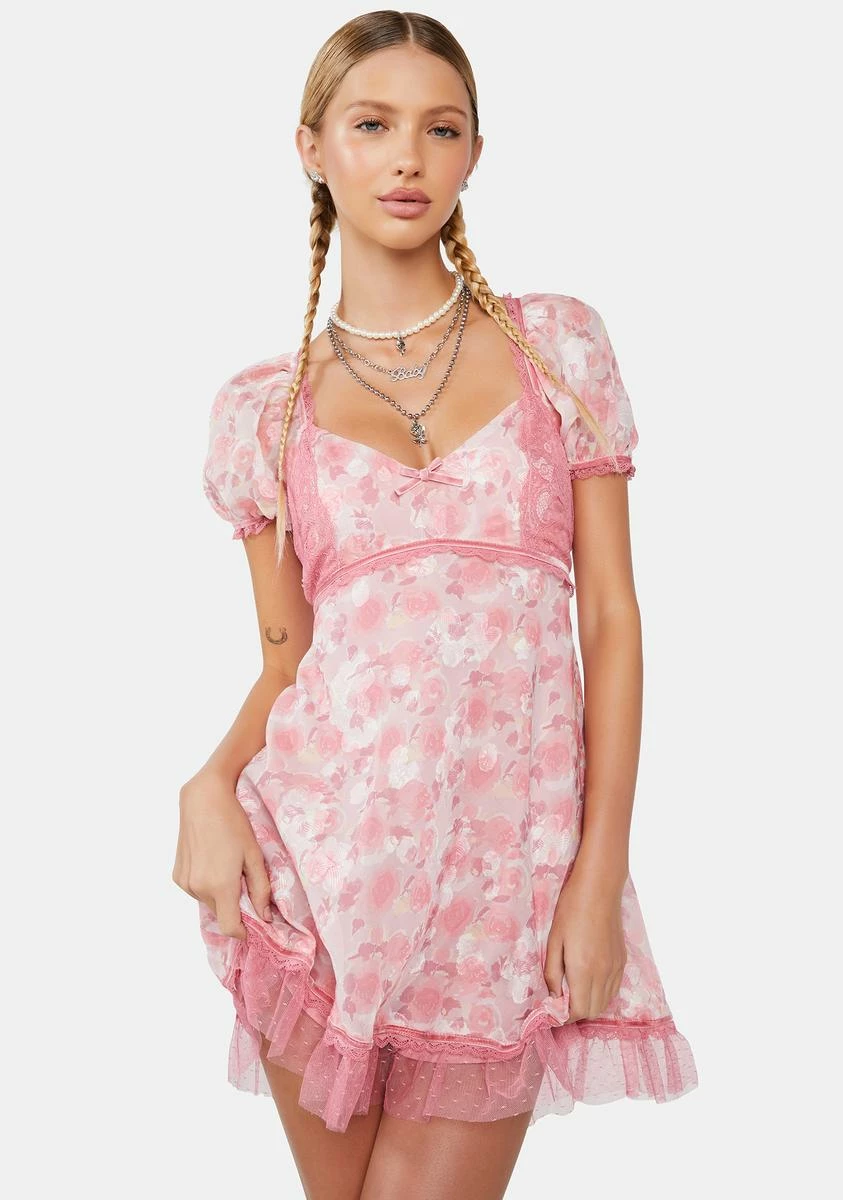 cuz we’ve got a perfect love story. This mini dress comes in a chiffon construction, with lace trim details, ruffle tulle details, short puff sleeves, a v-neckline, and a floral print all over.
