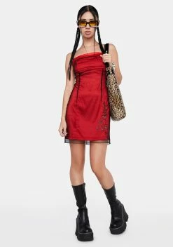 cuz the devil knows you by name. Take a risk in this mini dress that features a contrasting tulle overlay, a silky charmeuse body, beaded cherry shaped appliques, adjustable shoulder straps, and a back zip closure.