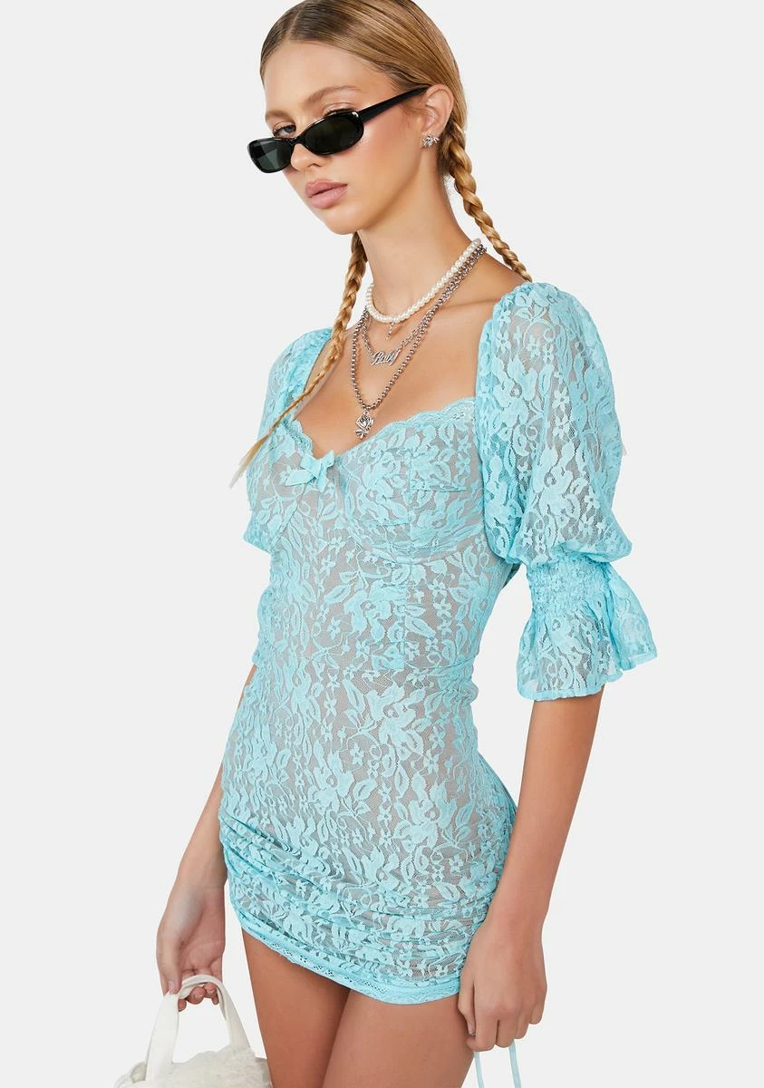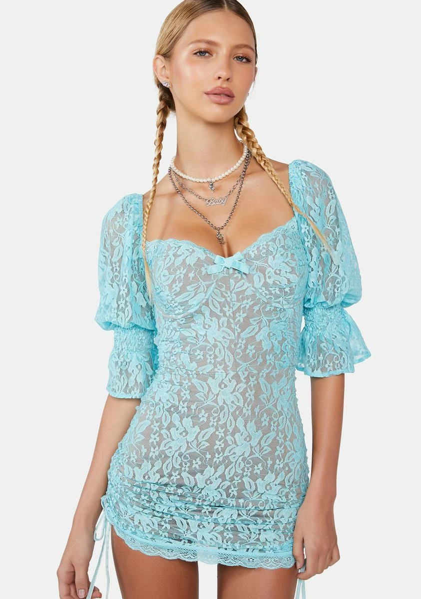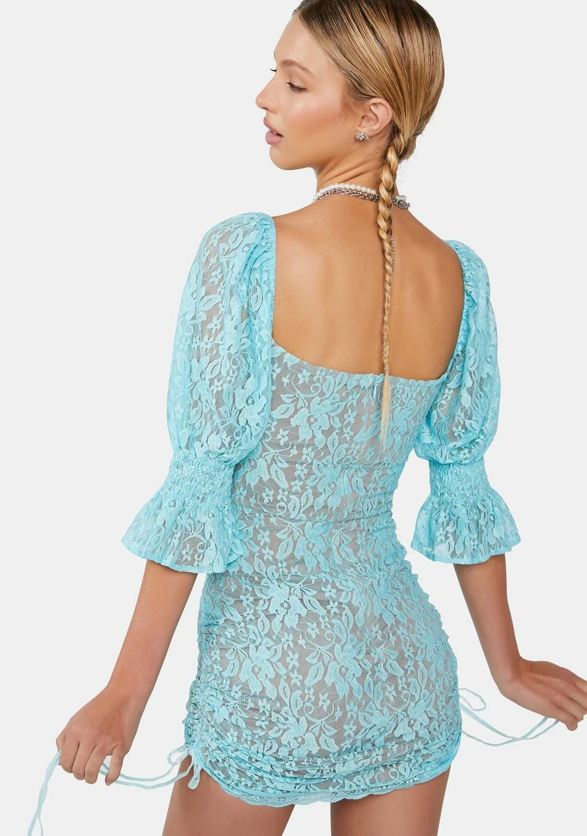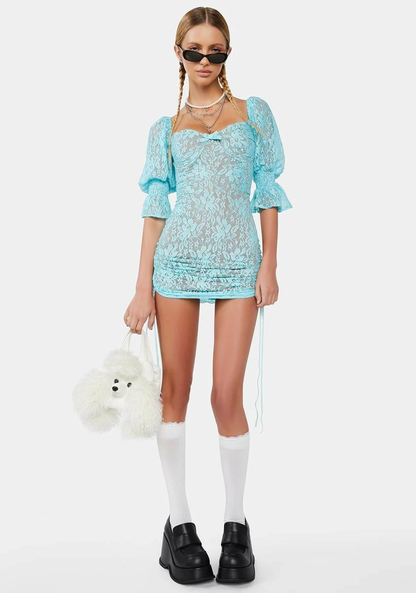 cuz you’re anything but casual, babe. This bodycon mini dress has a tan lining with an aqua lace overlay, mid-length puff sleeves with flared cuffs, a sweetheart neckline with a bow detail on the front, ruched sides with adjustable drawstrings, and a back zip closure.