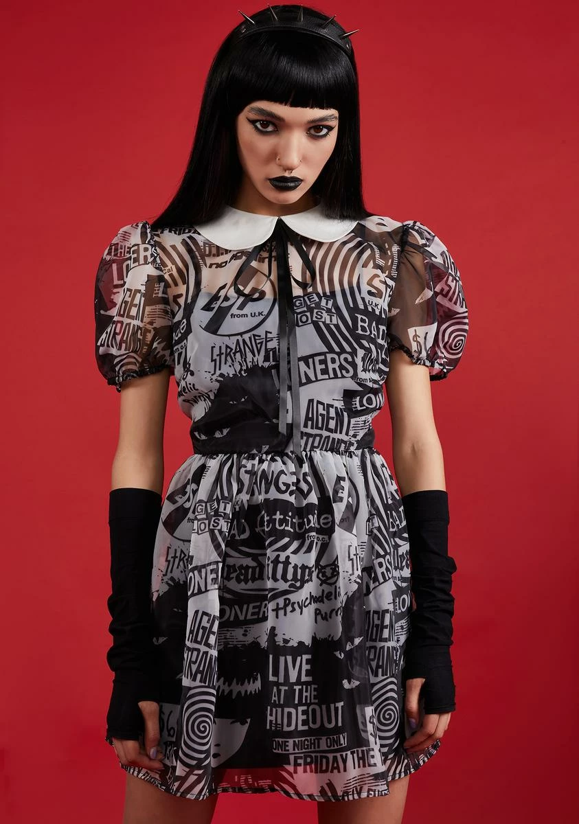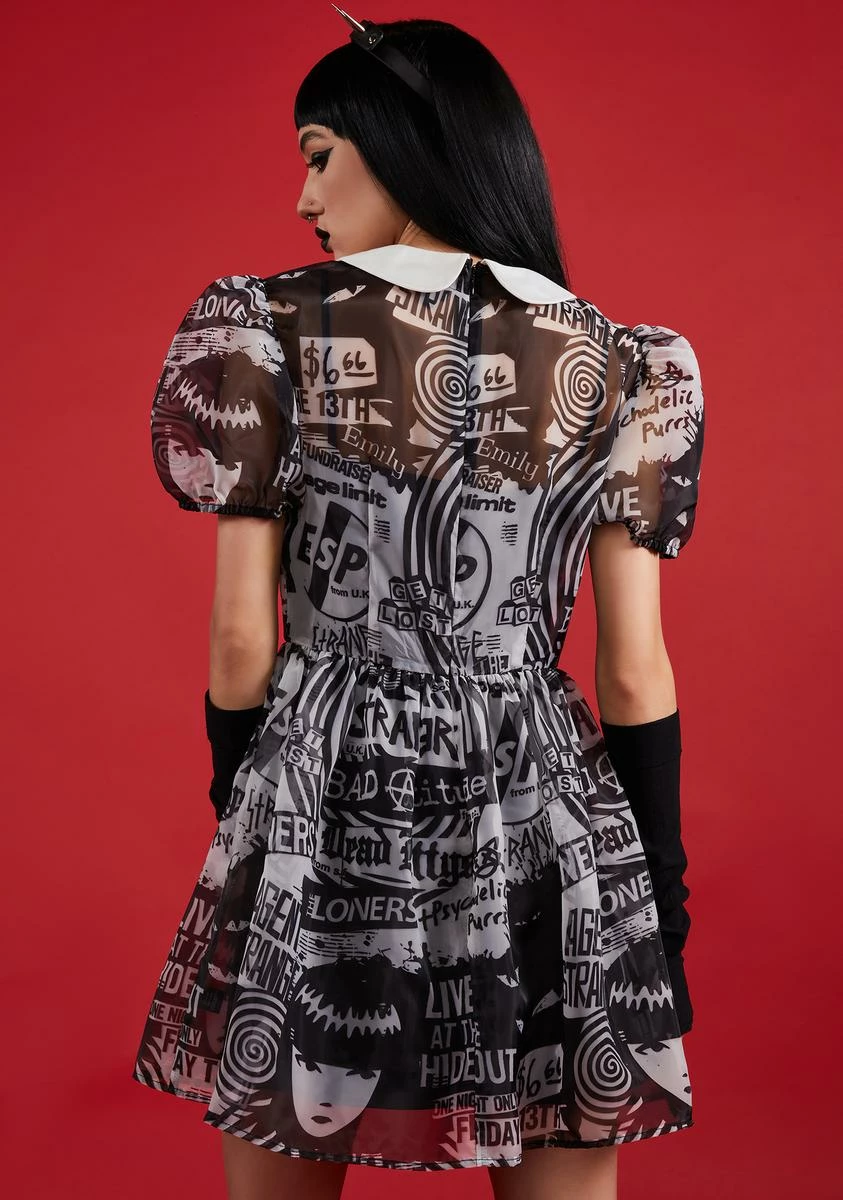cuz you ARE my problem. Show your adoration for Emily and all things strange in this organza babydoll dress which has a graphic collage print all over, a black slip underneath, a peter pan collar with ribbon detailing, puffy sleeves, and a back zip closure.