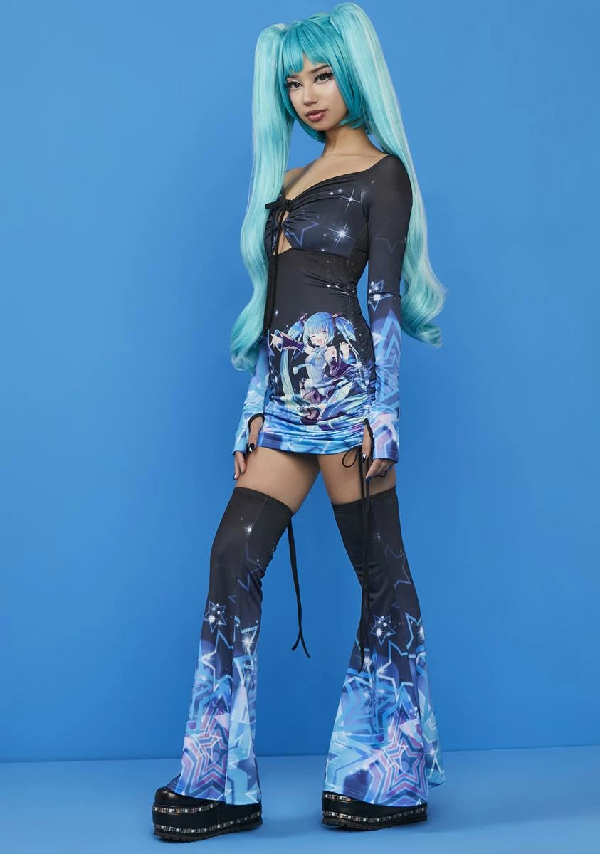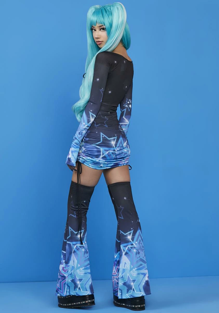 you were born to be a star! Shake up the virtual landscape in this set that includes a mini dress that has a sweetheart neckline with a keyhole cutout and adjustable ties, long sleeves with thumbhole cutouts, ruching details at the hips, a Hatsune Miku graphic across the front, and matching flared leg warmers with neon stars printed all over.