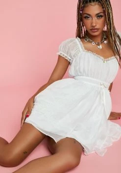 the spotlight is on you! Enjoy the attention in this babydoll dress that has a sweetheart neckline with scalloped trim, adjustable tie satin shoulder straps, a decorative bow and crisscross laces down the chest, a tiered ruffle skirt with organza overlay, and a zipper closure at the back.
