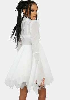 if I tell you I love you, can I keep you forever? This mini dress has a sheer chiffon construction, a netted underlayer and silky lining, a detachable self-tie lace trim collar with Casper embroidery, a V-neckline, long bell sleeves, a jagged hem, and a side zip closure.