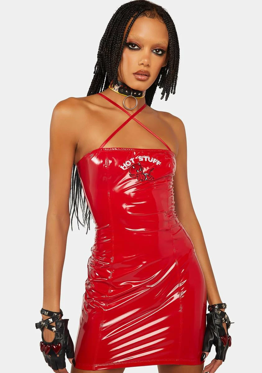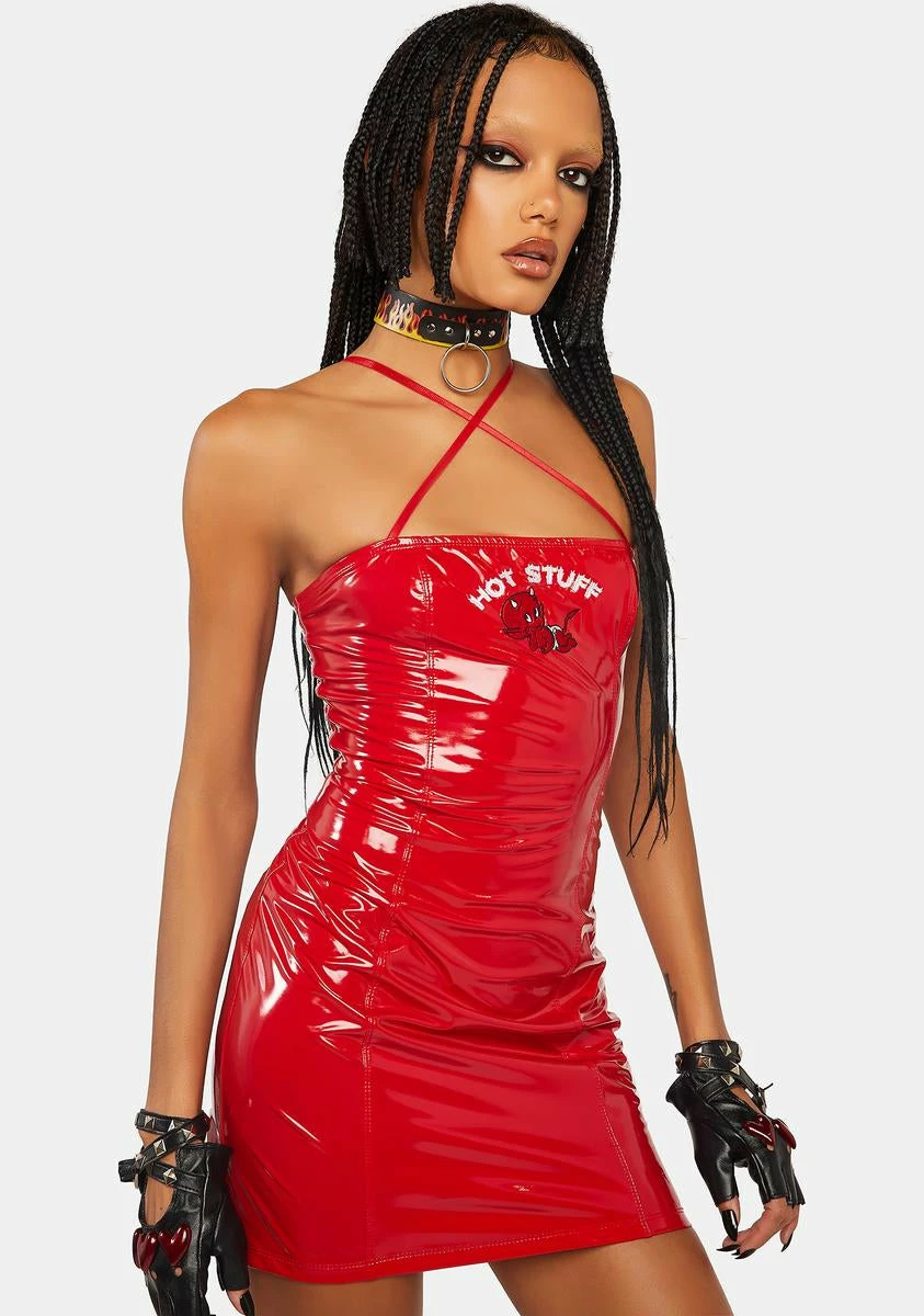 got you makin’ them sweat. This mini dress has a stretchy vinyl construction, Hot Stuff the Little Devil embroidered at front, adjustable crisscross shoulder straps, and a back zip closure.