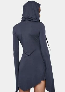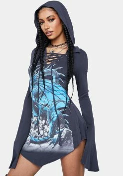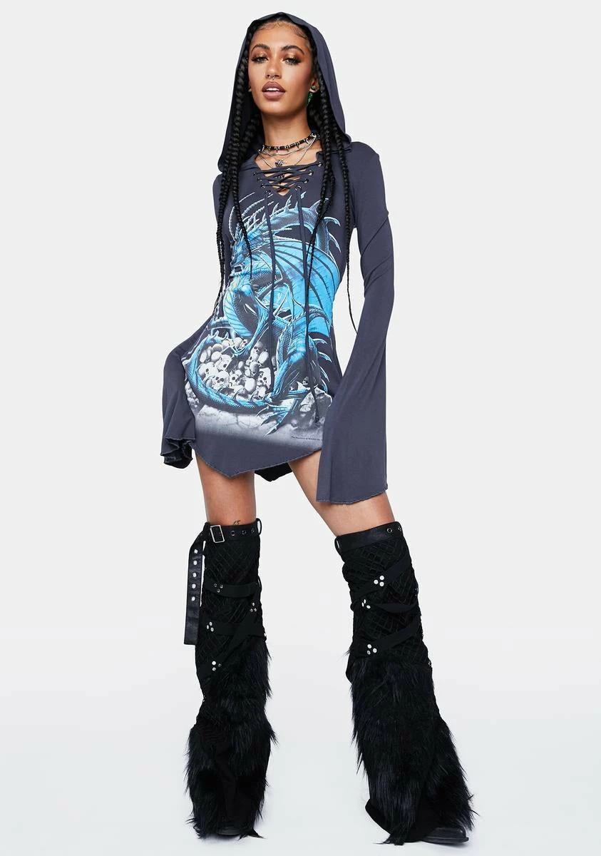cuz don’t mess with me. This mini dress has a hood, a lace up design with adjustable ties, long flared sleeves, a pointed hem, and a skull dragon graphic on the front.
