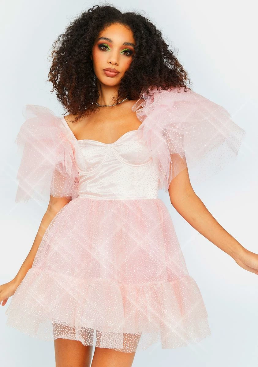 because you’ve gotta be a good one. This babydoll dress has a satin corset bodice with underwire support, sparkly tulle puff sleeves and skirt, back ties across the shoulders, and an invisible zipper closure.