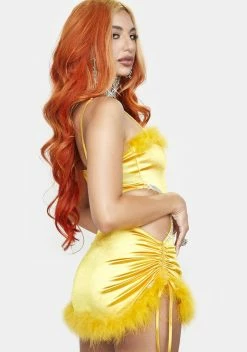 cuz you’re the one they want, babe! This satin mini dress has a cut-out construction, ruched sides with drawstring ties, jeweled details on the front, faux fur and shimmering rhinestone trim, and adjustable shoulder straps.