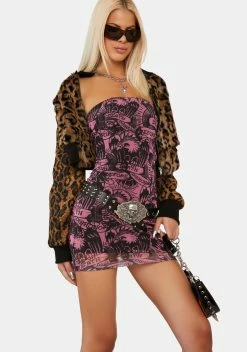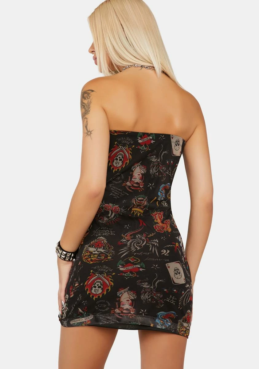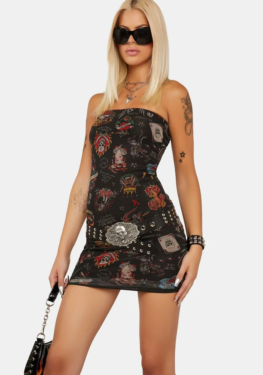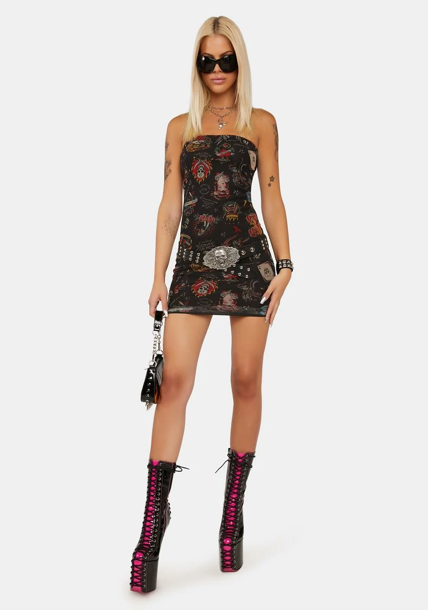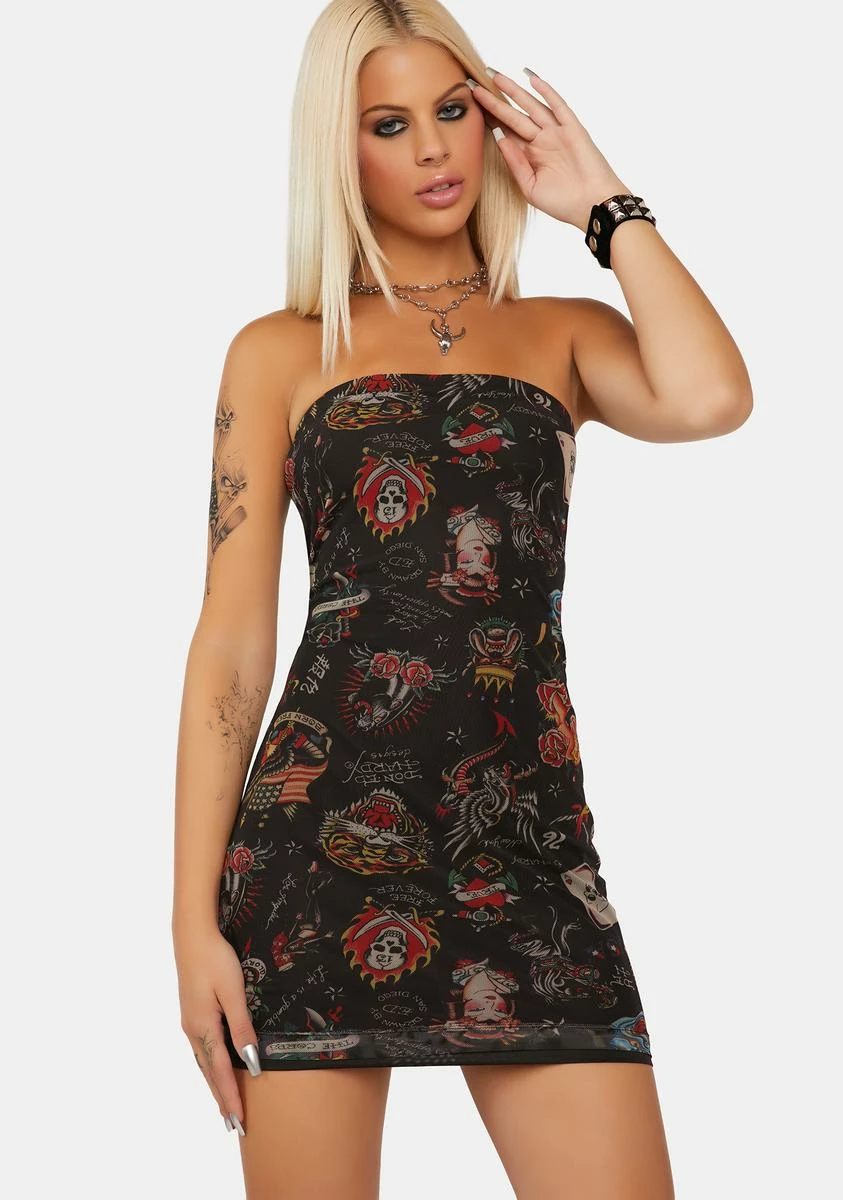 cuz you know what you want. This strapless mini dress has tattoo graphics printed all over, a stretchy mesh construction with opaque lining, and a bodycon fit.
