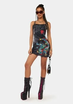 cuz you bring the heat. This slip mini dress has a mesh construction, adjustable shoulder straps, and a dragon print all over.