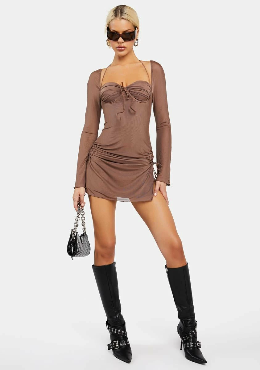 make them stop and stare. This long sleeve mini dress has a stretchy mesh construction, spaghetti straps, ruched bust cups, adjustable halter, side, and bust ties, side cutouts, and a back zip closure.