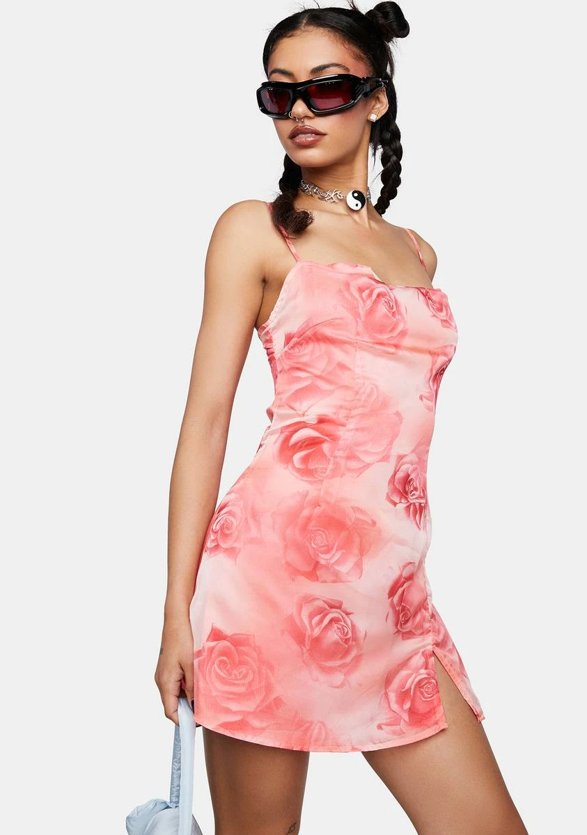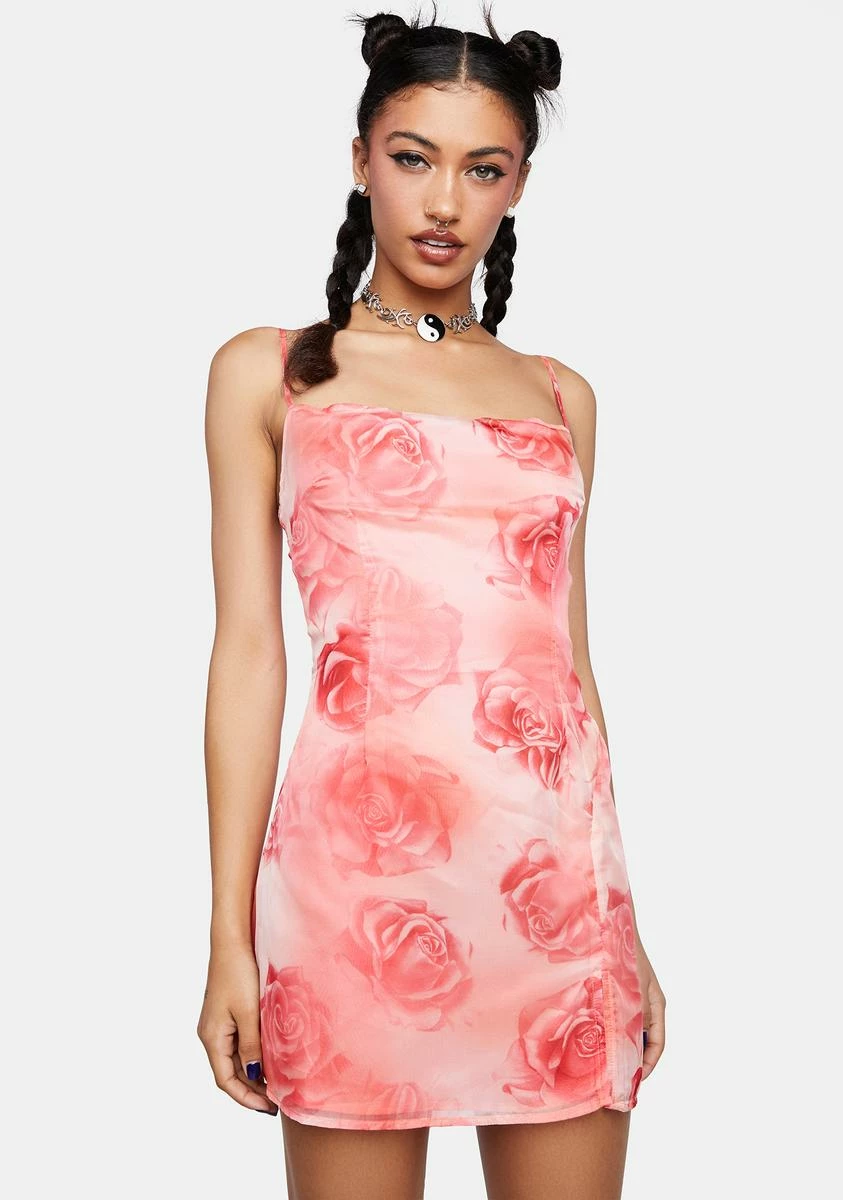 has you growin’ up. This mini dress has a shadowy rose print all over, a semi-sheer chiffon construction, a square neckline, a back zip closure, and adjustable shoulder straps.