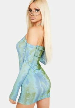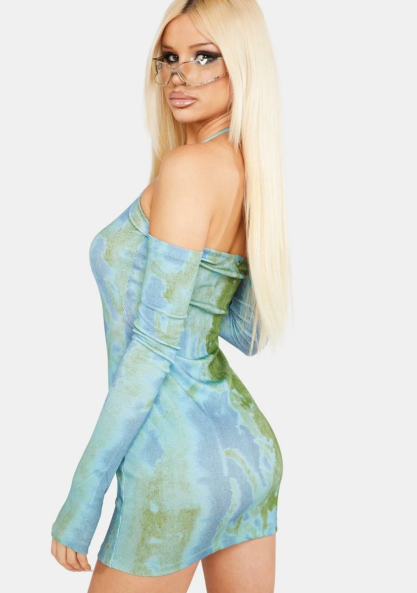 uz let’s party til dawn! This mini dress has a ribbed construction, an abstract print pattern, a halter neckline, an off the shoulder design, long sleeves with thumbhole cuffs, keyhole cut out detailing, and a bodycon fit.