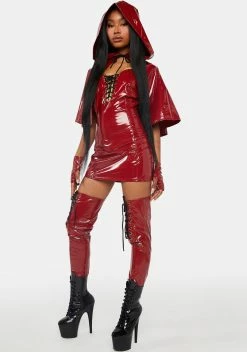 cuz off to grandma’s house we go. This costume set includes a vinyl dress with a halter neckline, front lace up closures, a hooded cape, fingerless gloves, and leg accessories with lace up closures.