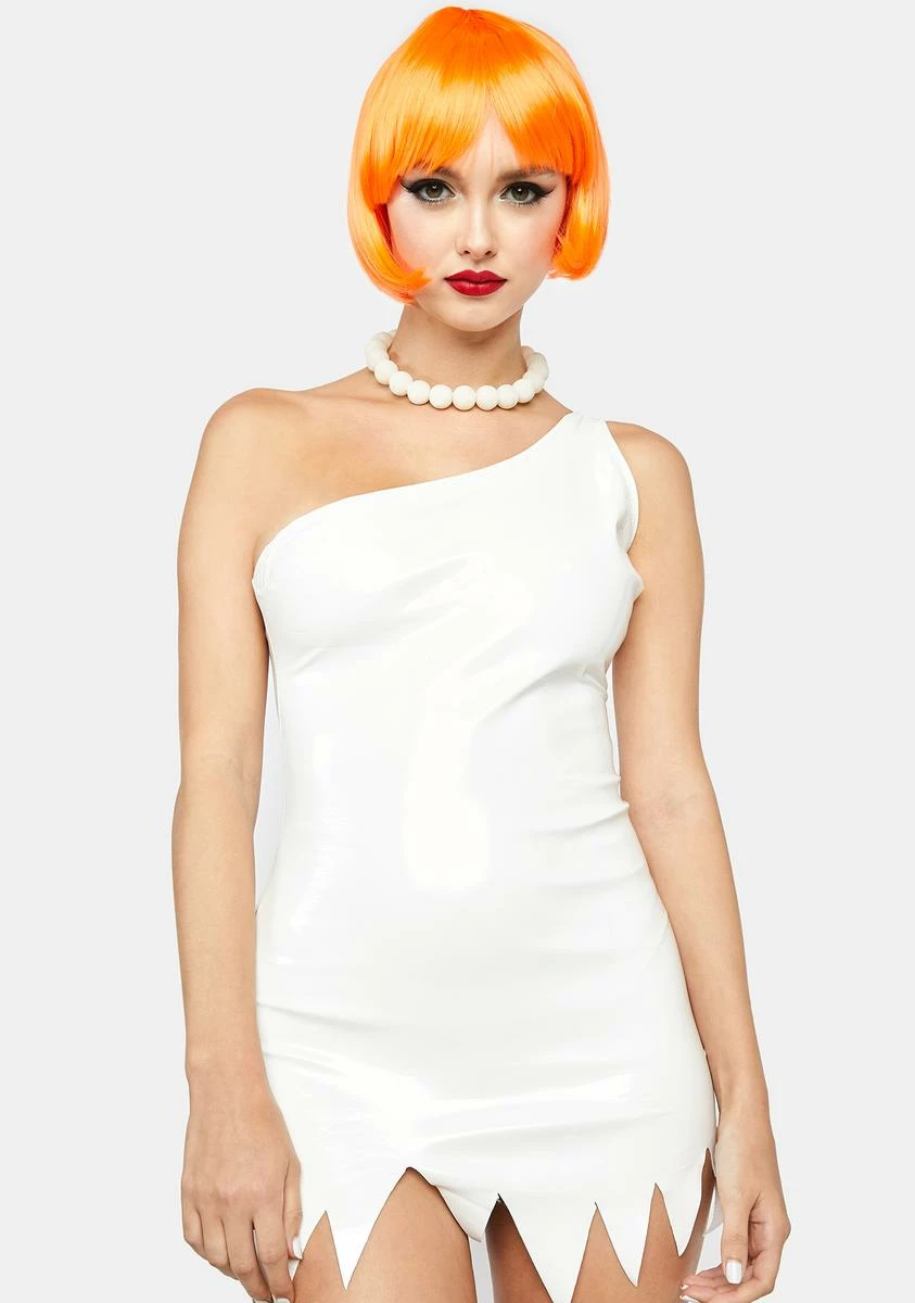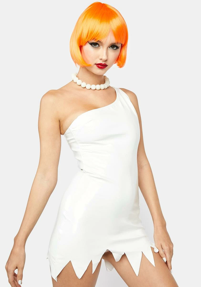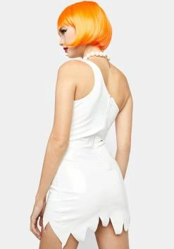 you’re a modern stone age woman! This costume set includes a vinyl one shoulder mini dress with a jagged hem and a zipper closure, and a chunky faux pearl necklace.