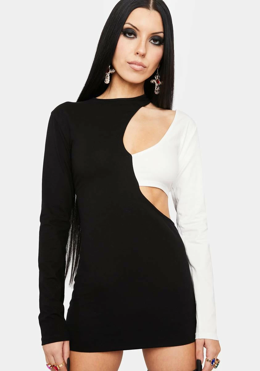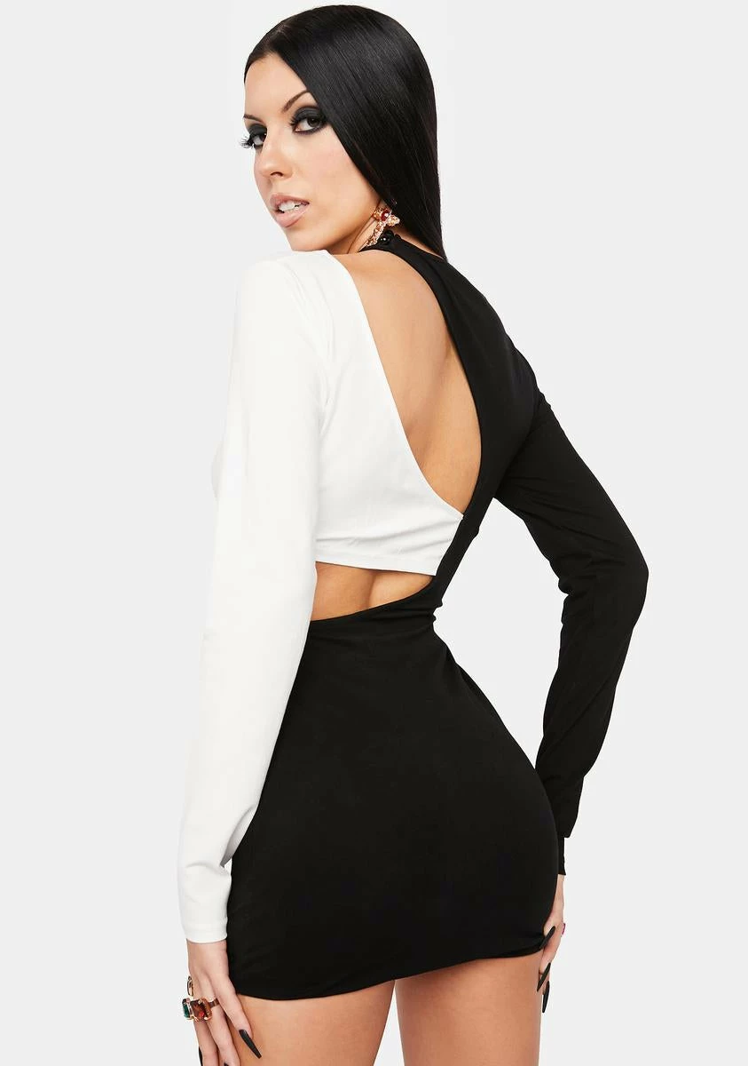 cuz be the best and nothing less. Get what you’re after in this mini dress which has a two-tone design, cut out detailing, long sleeves, and a back button loop closure.