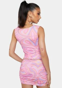 cuz it’s all about you! This mini dress has a trippy print all over, a cowl neckline, ruching along the sides, a bodycon silhouette, and comes with a chain waist belt with an adjustable clasp and a rhinestone crescent moon charm.