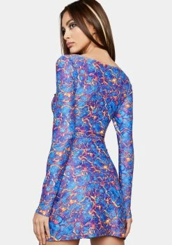 cuz you always bring the heat! This long sleeve mini dress has a stretchy bodycon fit, triple cut-outs on the front with O-ring hardware, and a lava print all over.