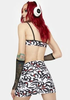 cuz you’re a dangerous diva. This mini dress has a strappy halter neckline with a criss-cross design, cut-out sides and back, adjustable shoulder straps, and a tattoo print all over with flashes of red.