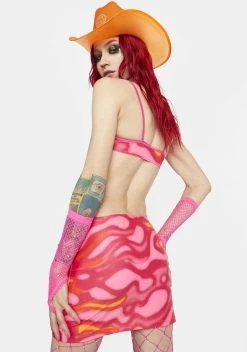 has a strappy halter neckline with a criss-cross design, cut-out sides and back, adjustable shoulder straps, and a stretchy mesh construction with a lava swirl print all over.