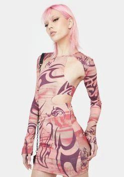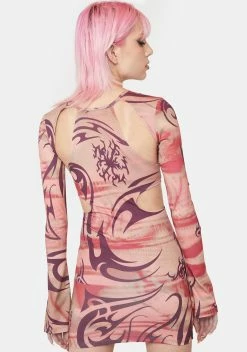 cuz you leave ’em all in the dust. This bodycon mini dress has long sleeves, cut-out designs, and an abstract tattoo print all over.