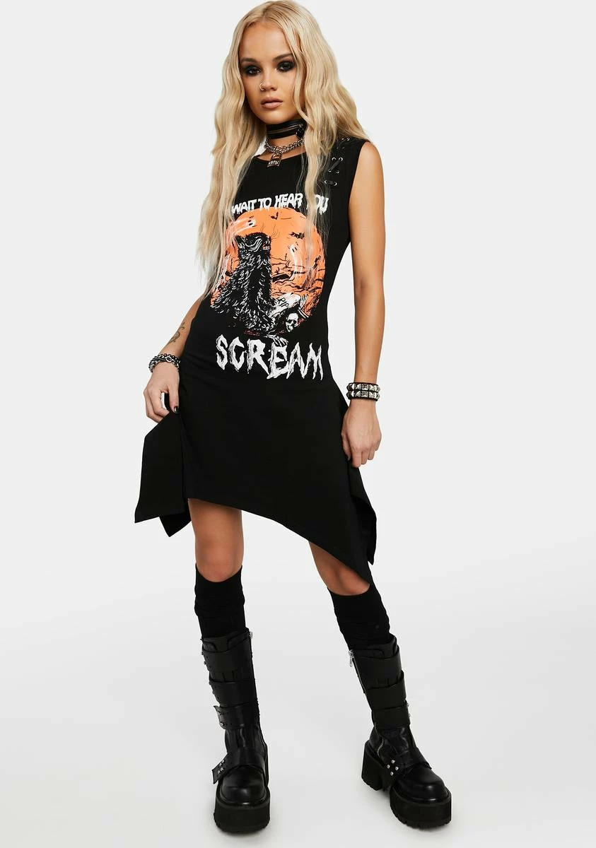 cuz things are getting spooky! This mini dress has “I Can’t Wait To Hear You Scream” and a graveyard cat printed at front, lace-up ribbons at the shoulders, and an asymmetrical hemline.