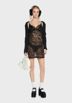love me or hate me! This mini dress has a sheer lace construction, a V-neckline, and adjustable shoulder straps.