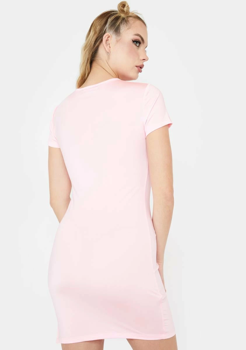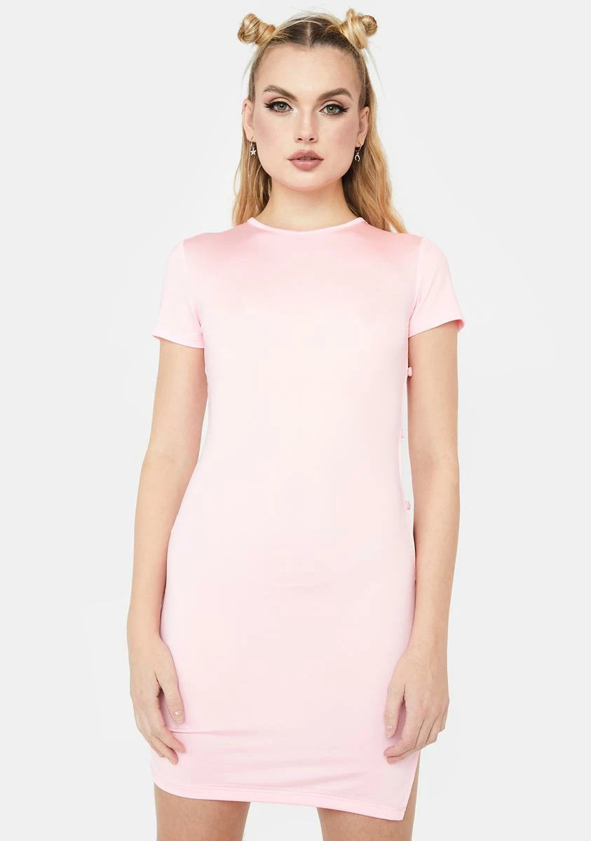 for a blushing beauty. This mini dress comes with cut outs and a slit on one side, short sleeves, and a round neckline.