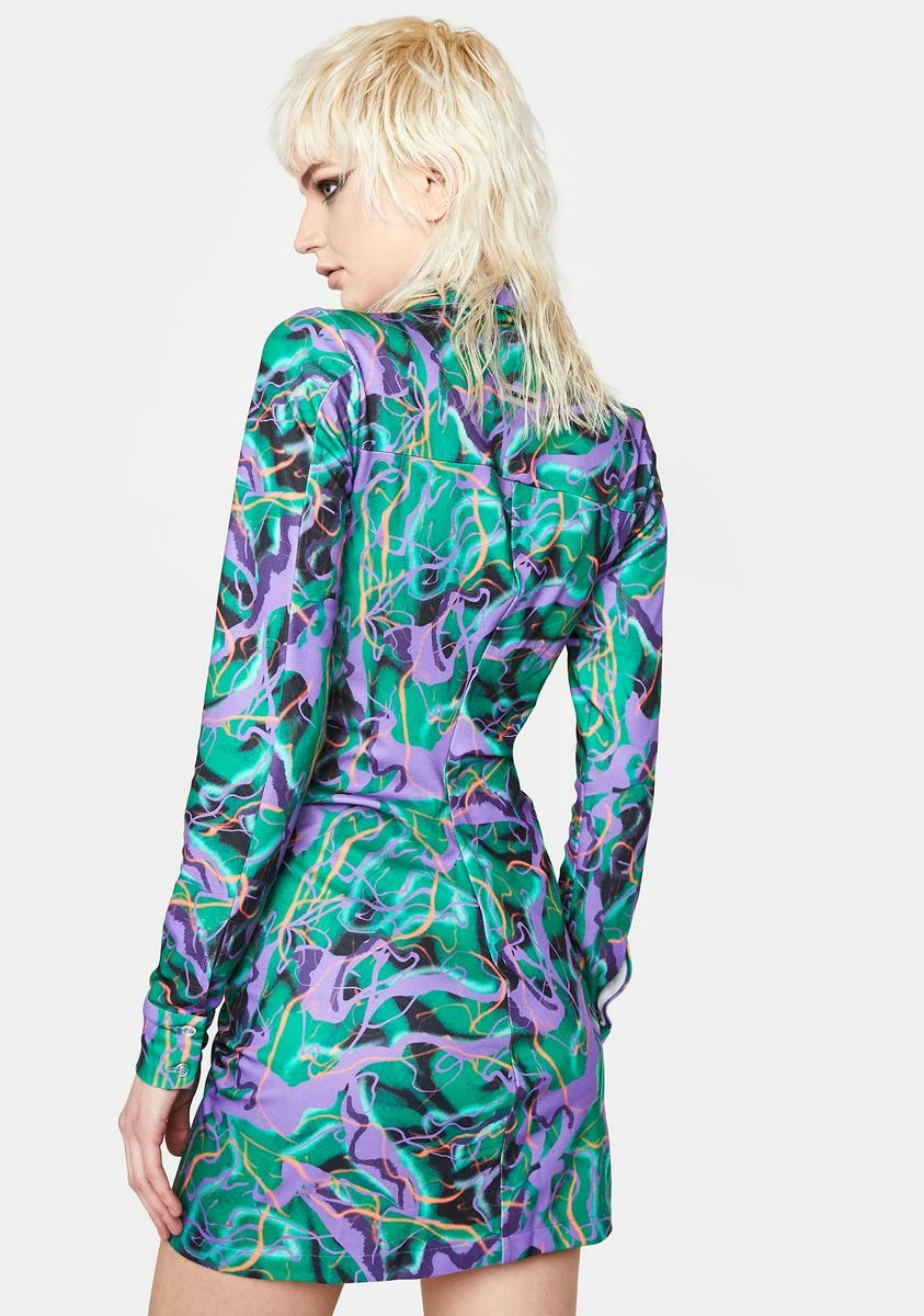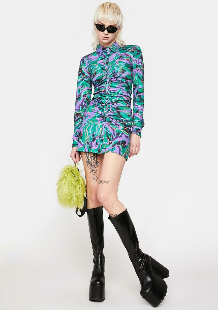 cuz you like it wild! This long sleeve shirt dress has a ruched construction with a bodycon fit, button closures on the front, a collar detail, and an abstract print all over.